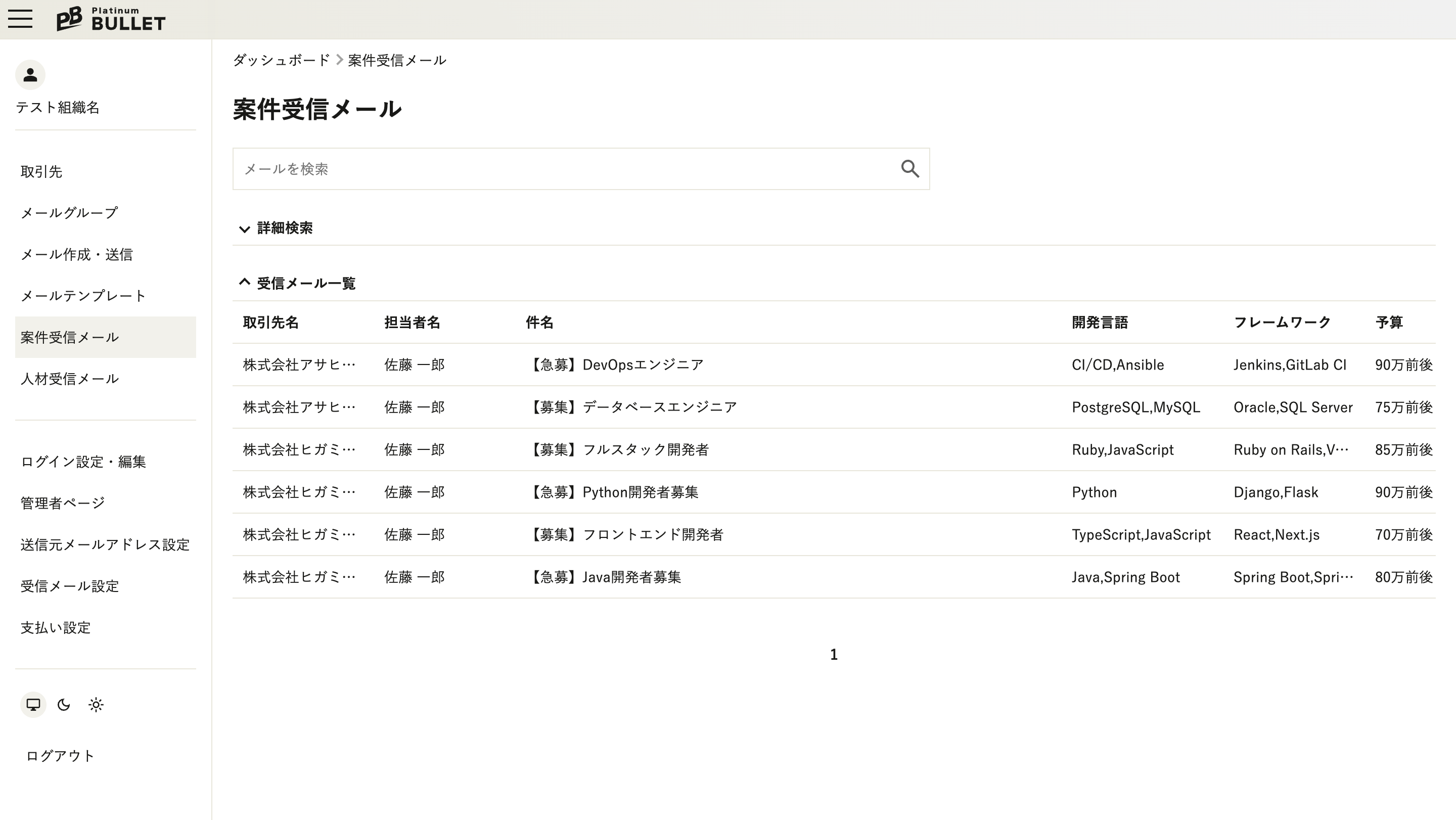 画面左の(スマートフォンの場合は右上の)メニューから[案件受信メール]または、[人材受信メール]を押すとメール一覧が表示されます。